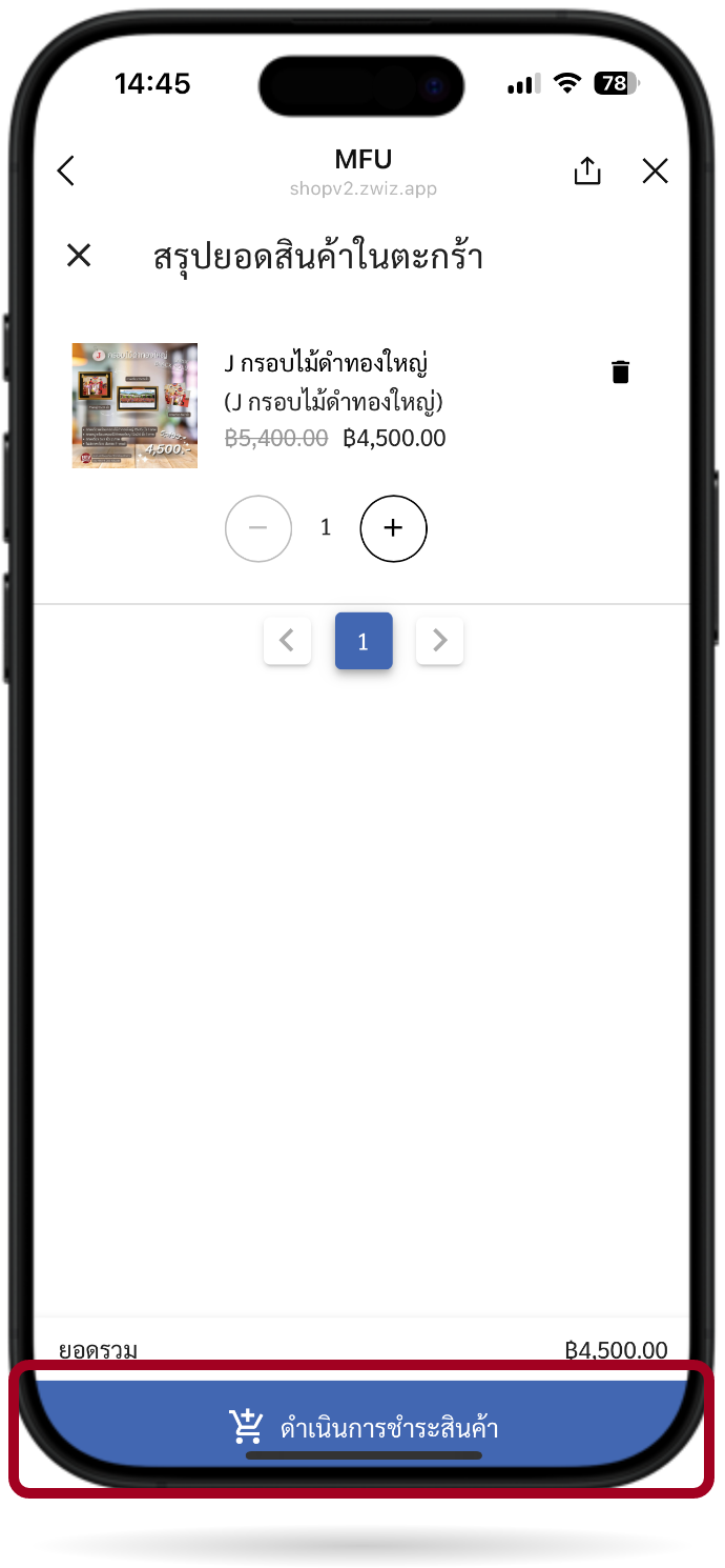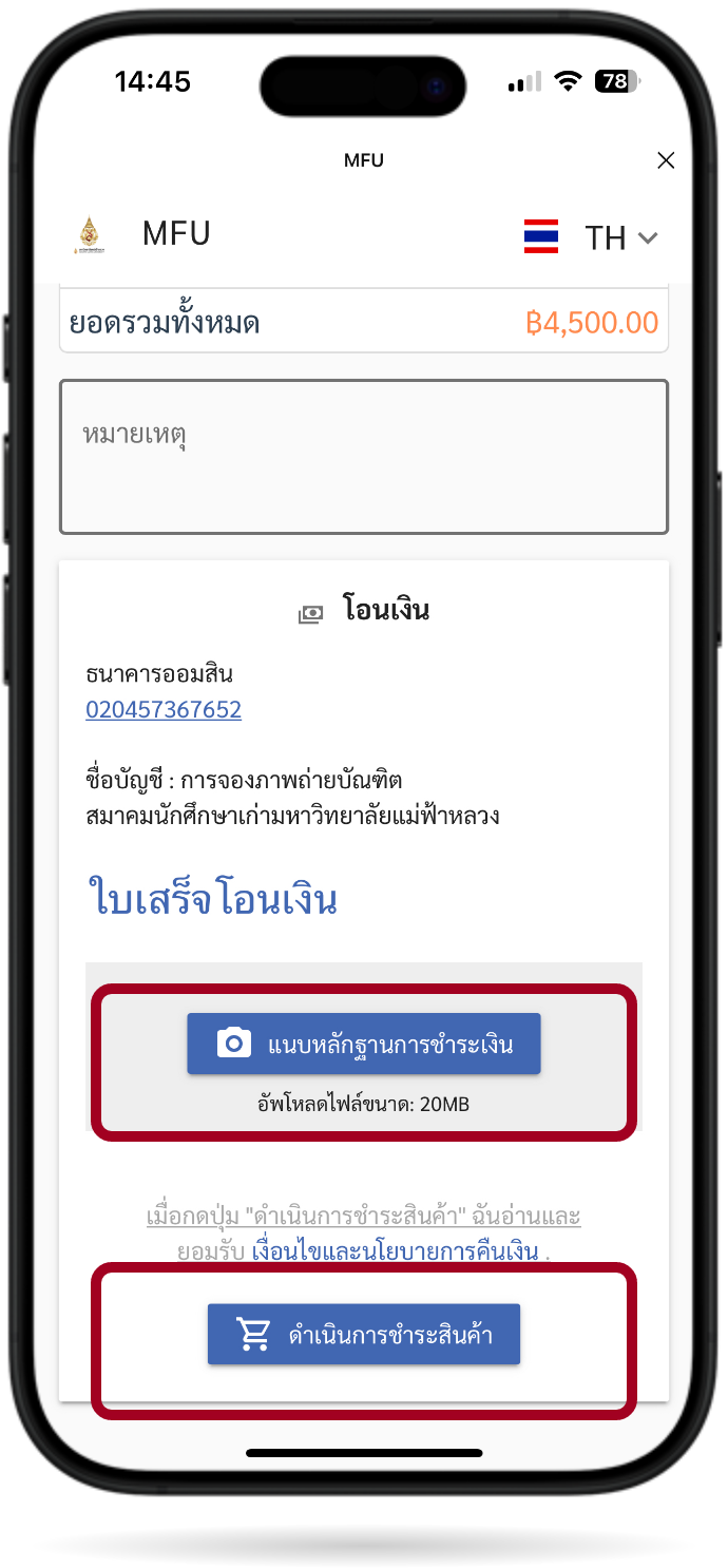 8. ชำระเงินตามยอดรวมทั้งหมด และกด “แนบหลักฐานการชำระเงิน” พร้อมแนบสลิป และกด “ดำเนินการชำระสินค้า”
